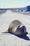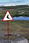 | Ungewohnt für Besucher wie mich war es vor allem, dass auf dem gesamten Gelände der Station keine Zäune vorhanden waren. Die See-Elefanten konnte man überall in der Station finden. Manchmal kan es auch vor, dass sich so ein Tier inmitten der Station auf der Straße sonnte( Bild rechts). Aus diesem Grund dürfen die notwendigen Sicherheitshinweise natürlich nicht fehlen ! (Bild links) | ||