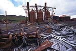 Lediglich ein kleiner Teil der gesamten Anlage wurde restauriert, um sie vor dem totalen Verfall zu bewahren und Wohnmöglichkeiten für Wissenschaftler zu erhalten, so z.B. die beiden Häuser (Bild links). Die alte Schiffsschraube wurde von den Walfängern zurückgelassen (Bild rechts). |