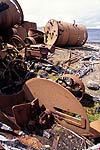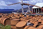 um die Gebäude herum liegen hunderte von verrrosteten Fässern,